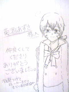 クリックすると 元の大きさになります。 菊酒あずささまへ 捧げます。 文字が汚いのなんのorz ぐだぐだですが、気持ちはこもってますから…っ。 こんな私の相手をしてくださってありがとうございました! さよならは言わないZE☆←うぜぇ